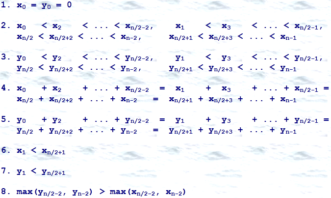 It is useful to define a principal or standard form for all the Franklin squares that can be transformed into each other. The form outlined by Hurkens in the search for order 12 Franklin squares is defined by first row and first column tuples x = x0, ... , xn-1 and y = y0, ... , yn-1. For convenience, every second element, (starting with x1 and y1), is the complement of the actual number. The tuples then have these properties: